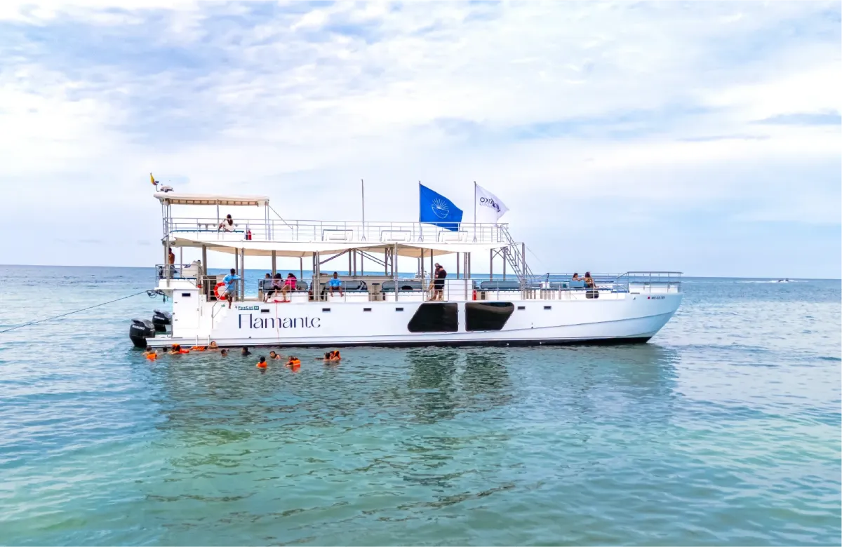Descubre el archipiélago de las Islas del Rosario a bordo del recorrido más nuevo en catamarán que ofrece Cartagena. El Catamarán Flamante ha sido diseñado para quienes buscan una travesía fresca, con tecnología de navegación de punta y amplios espacios para relajarse bajo el sol caribeño. Esta embarcación destaca por su comodidad y estilo, permitiendo que cada pasajero viva una aventura memorable mientras surca las aguas turquesas del Caribe colombiano con total seguridad y un servicio excepcional de principio a fin.